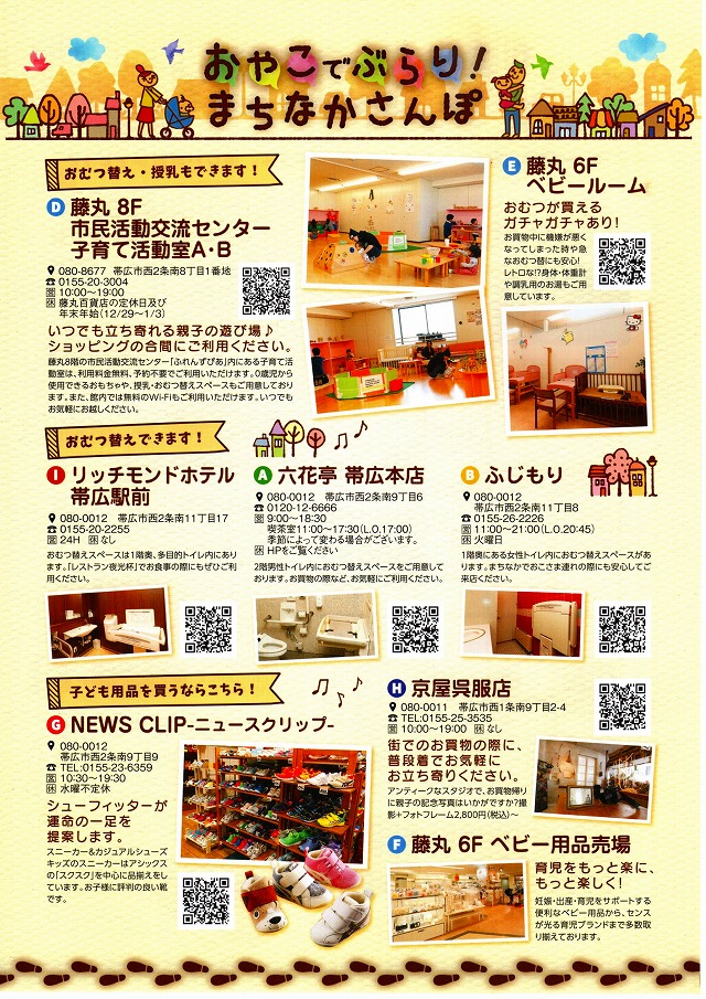 おむつ替え・授乳ができるところ、ランチ・おやつを提供するお店、子供用品を取り扱うお店を掲載