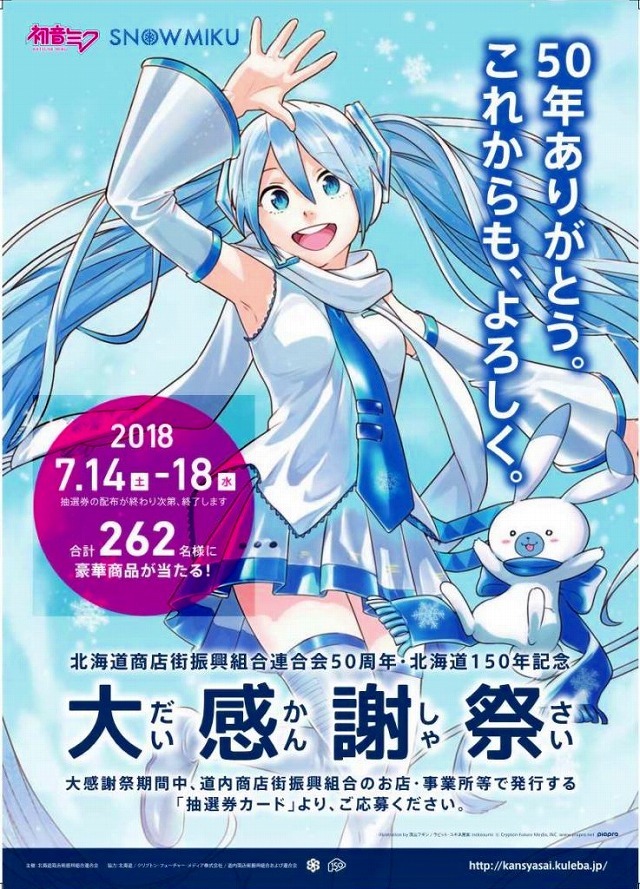 北海道商店街振興組合連合会創立50周年と、北海道命名150年を記念し、ありがとうの感謝と未来への決意を込めて記念「大感謝祭」を行います。