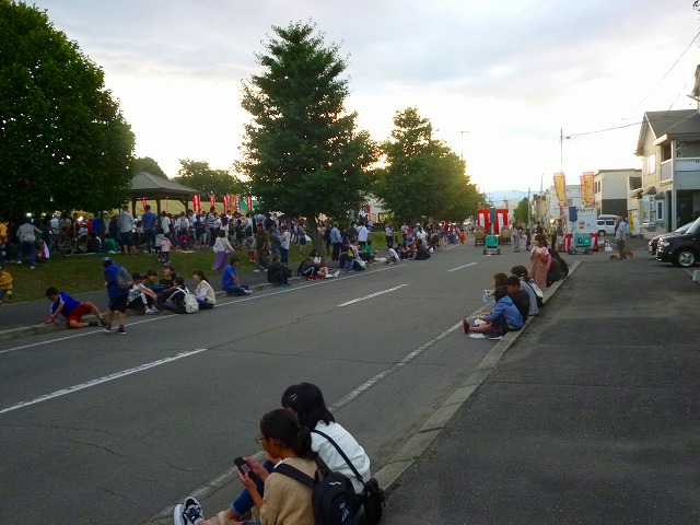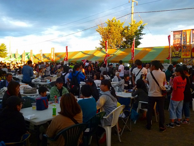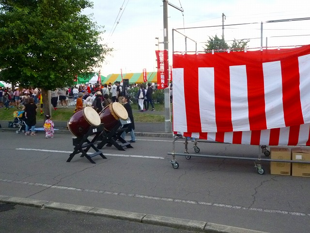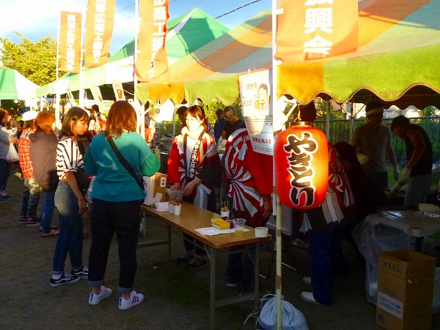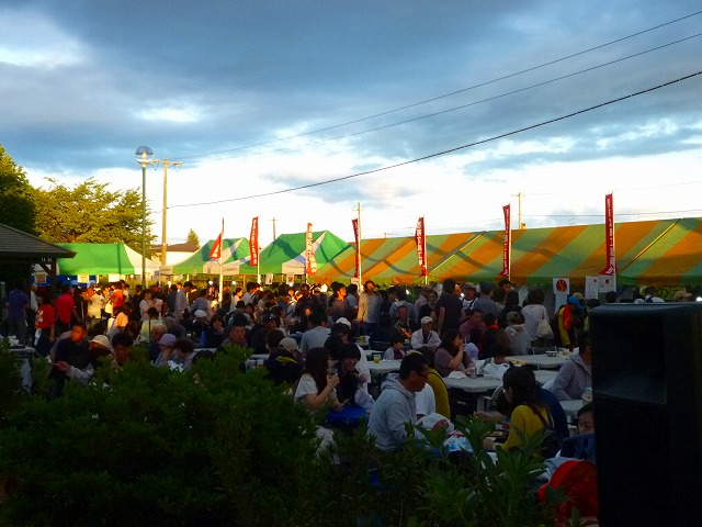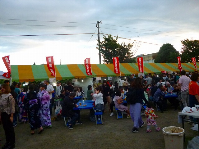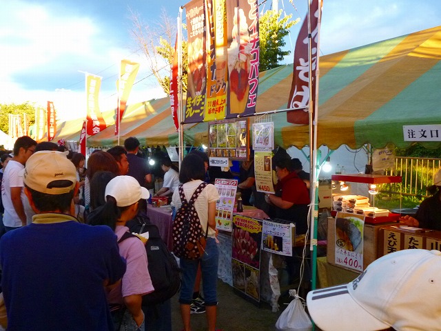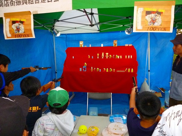 やきとりコーナーやその他の売店前は行列でいっぱいです・・・ 盆踊りの櫓も準備 ステージも準備・・・ 子供達には射的が人気・・・ 会場は、沢山の来場者で溢れています