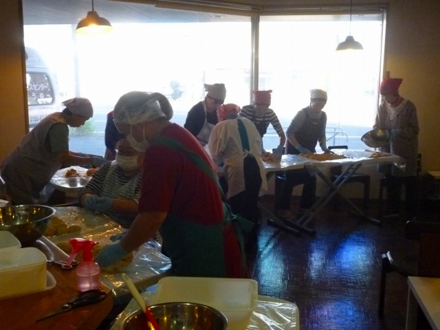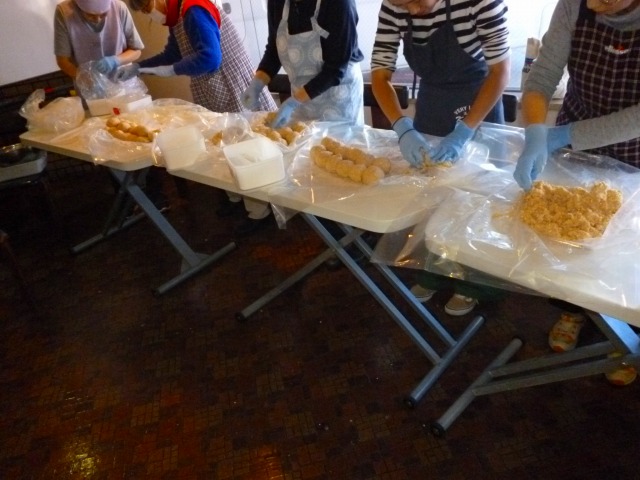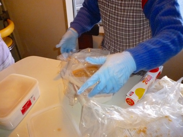 団子をつくり・・・容器に叩きつけるように入れていきます(空気が入らないように)